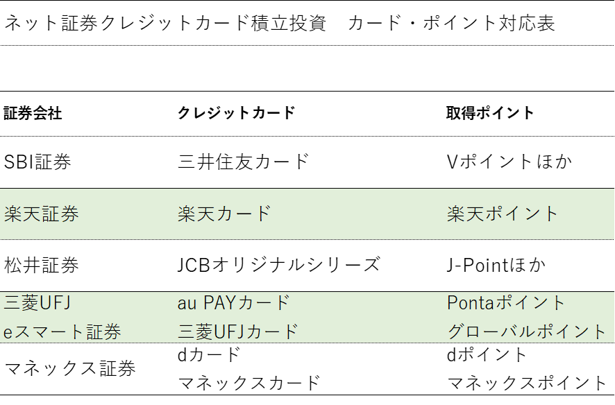 ちなみにクレジットカードとポイントの対応は以下の通りです。