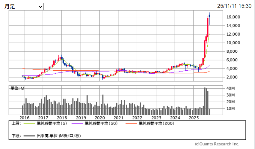 2025年から急激に株価が上昇し、1年足らずで4倍になりました。