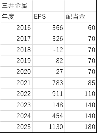 2021年3月期からは比較的安定していますが、それ以前は金属市況に左右されたのか、赤字の年も見受けられます。でも安定配当です。