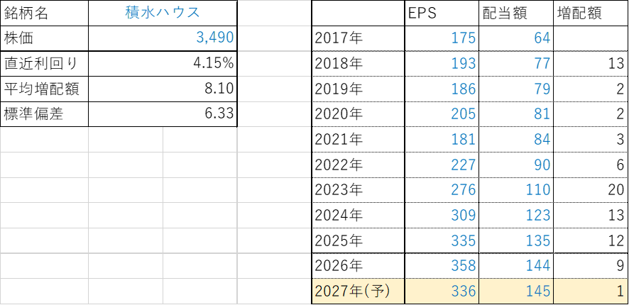 平均増配額は8円程度。利回りは4.15%でまあまあ高めです。