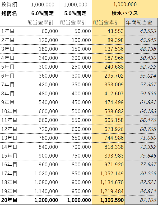 投資額を1百万円として、平均増配額から予想した今後20年の配当金累計を、利回り6%と5%の場合と比較した結果が下の表となります。