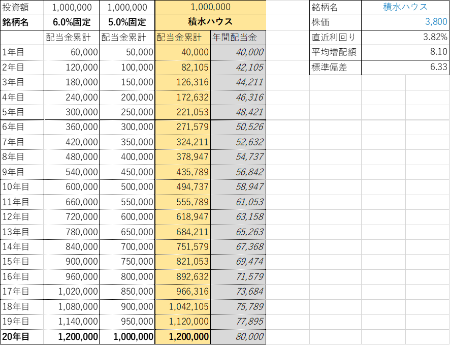 現状の株価で6.0%利回りの株の配当総額を20年後には上回る計算です。
